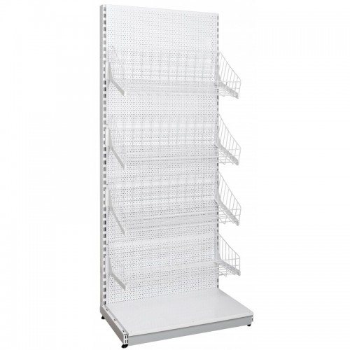 Стелаж з кошиками складається з двох стандартних бічних стійок, на які встановлюються кронштейни і сітчасті кошики. Задня частина може бути закрита декоративними, сітчастими або перфорованими панелями. Всі елементи стелажа з кошиками виготовлені з металу і пофарбовані в білий колір.